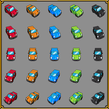 A collection of 5 coloured cars (Porsche model) on pixel art isometric view.